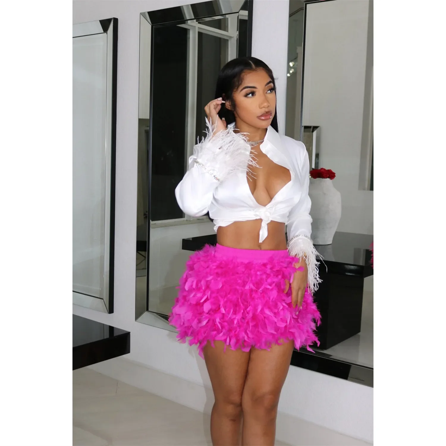Elevate your style with this captivating Feather Mini Skirt. Luxurious feathers create an alluring, textured look that exudes confidence and sophistication. The flattering mini length showcases your best features while the feather detailing adds movement and dimension with every step. Whether you're heading out for a night of dancing or making an entrance at an upscale event, this skirt delivers undeniable glamour. Own the room in this show-stopping piece.